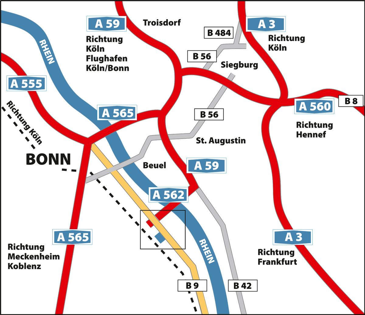 Über A 565 (Abf. BN-Poppelsdorf), über Adenauerallee (B9 Richtung Bad Godesberg) oder über A 59 / A 562 (Abf. BN-Rheinaue Richtg. Bad Godesberg) Zufahrt über Godesberger Allee oder über Annaberger Straße (Tiefgaragen-Einfahrt)