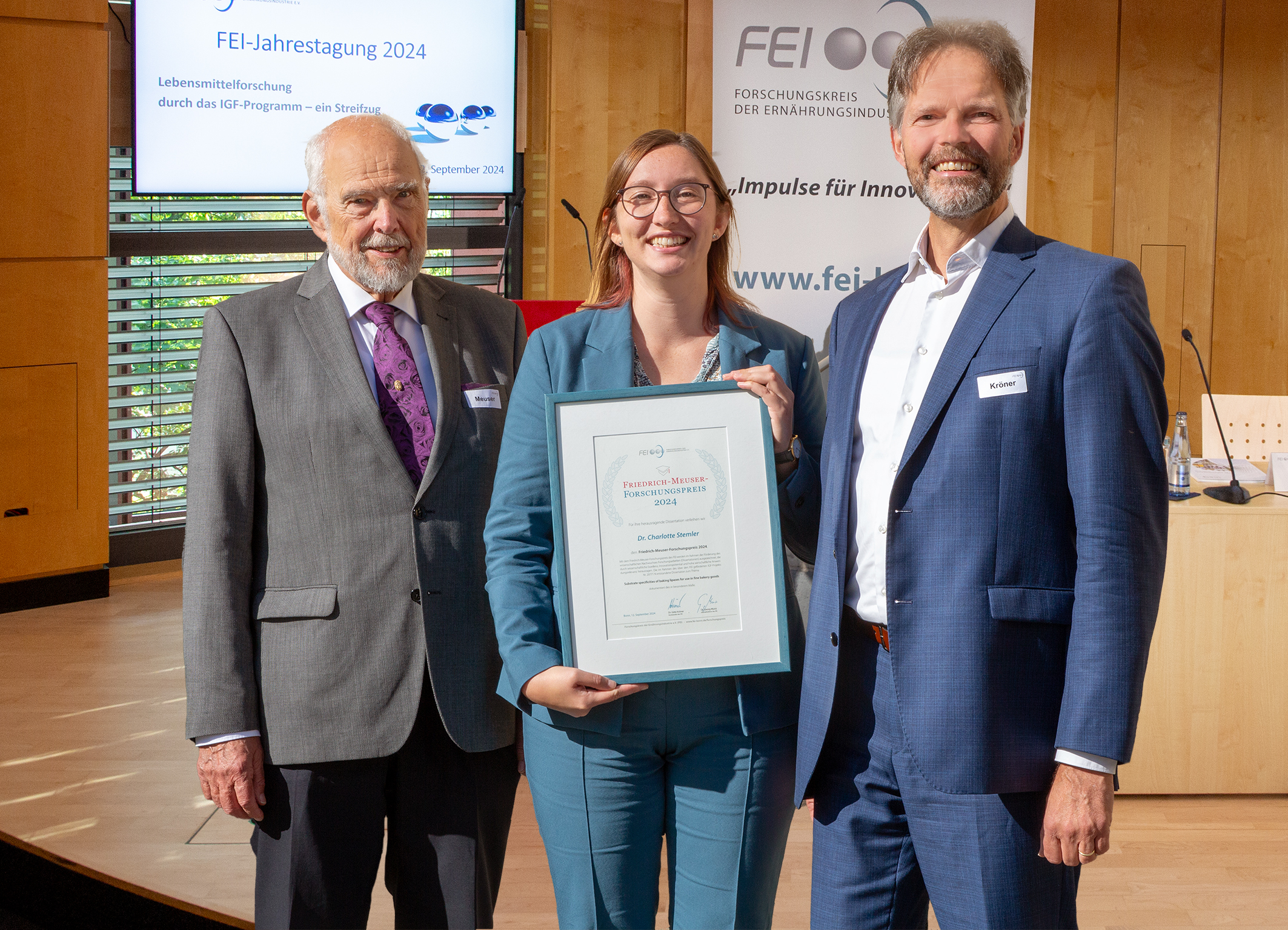 Am 12. September 2024 wurde der Friedrich-Meuser-Forschungspreis zum sechsten Mal verliehen. In Anerkennung ihrer besonderen wissenschaftlichen Leistungen im Rahmen ihrer Dissertation wurde Dr. Charlotte Stemler mit dem Friedrich-Meuser-Forschungspreis 2024 des FEI ausgezeichnet.