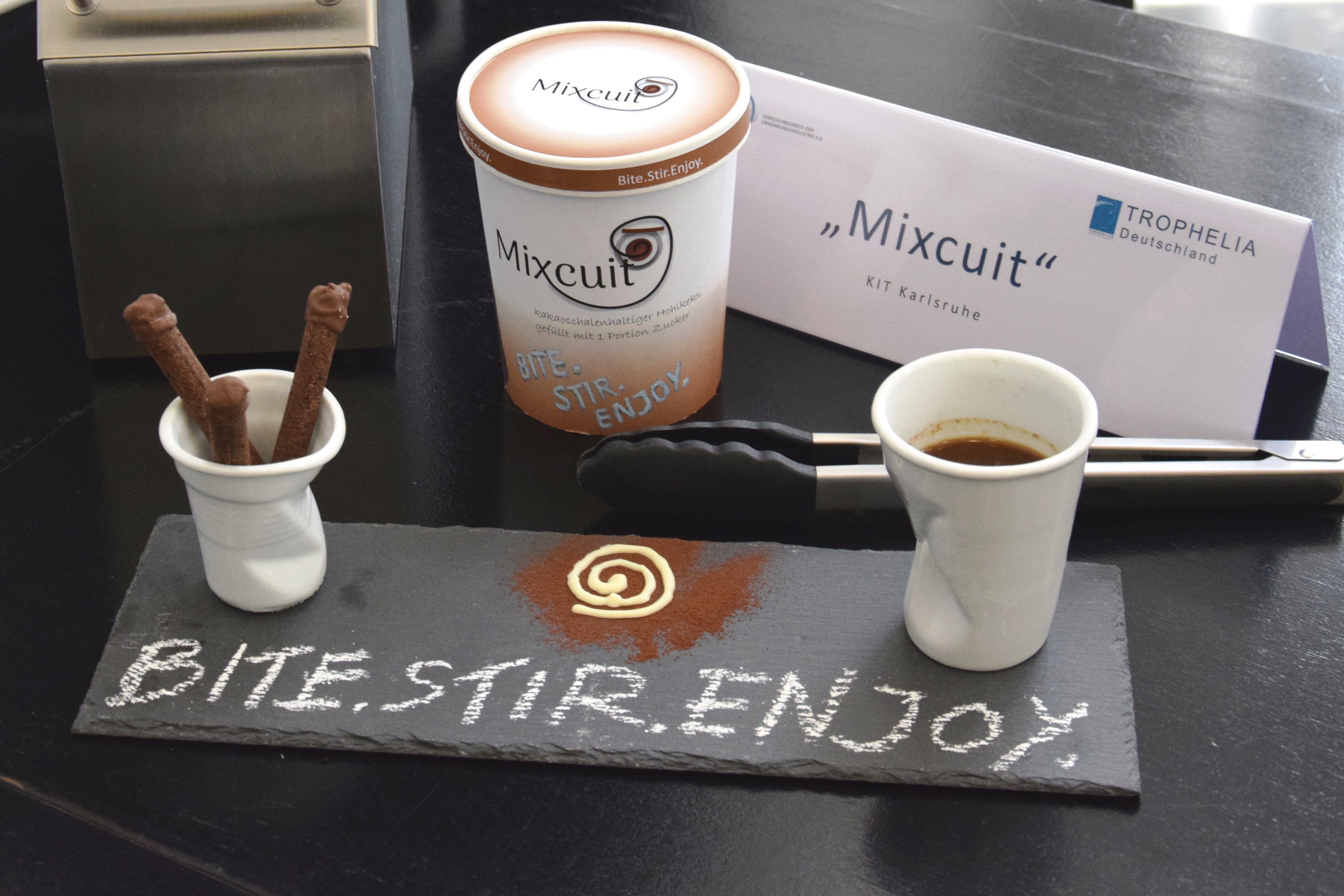 Bei der Karlsruher Idee ist schon der Name vielversprechend: Aus "mix" (deutsch: rühren) und "biscuit" (deutsch: Keks) wird "Mixcuit", ein "Rührkeks", der es in sich hat – denn der hohle, rollenförmige Keks ist mit einer Portion Zucker gefüllt. Nach dem Abbeißen des Schokoladendeckels schüttet man den Zucker in ein Heißgetränk und rührt diesen mit dem Keks ein, bevor man den Keks zum Kaffee oder Tee genießen kann. "Mixcuit" ist eine raffinierte und ökologische 3-in-1-Lösung: Plastikrührstäbchen und Zuckertütchen werden ersetzt – und so jede Menge Müll vermieden. Zudem erhalten Verbraucher einen schmackhaften Keks, der durch seinen hohen Kakaoschalenanteil über eine feine Kakaonote verfügt und obendrein noch den täglichen Ballaststoffbedarf zu 15 Prozent abdeckt. Auch in Sachen Variabilität punktet "Mixcuit": Anstelle des Zuckers kann der Hohlkeks auch mit Milchpulver, Kakao oder Instantkaffee gefüllt werden.