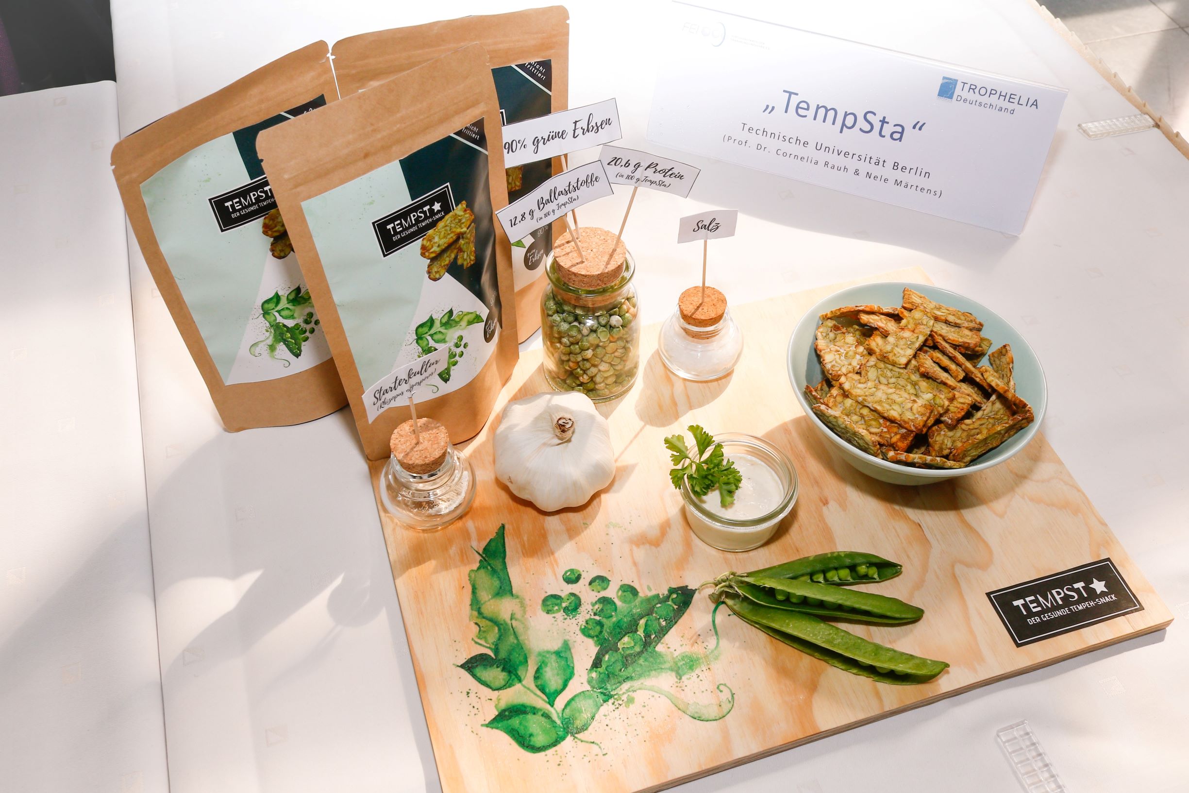 Für das indonesische Fermentationsprodukt Tempeh werden traditionellerweise gekochte Sojabohnen mit einem Pilz kultiviert – in "TempSta" werden die Sojabohnen durch regional angebaute Erbsen ersetzt, um weite Transportwege für die Rohstoffe zu vermeiden. Nach der Fermentation der Erbsen mit dem Pilz Rhizopus oligosporus wird der Erbsen-Tempeh in dünne Scheiben geschnitten und heißluftfrittiert. Dabei wird Rapsöl sehr fein zerstäubt und mittels Luftzirkulation verteilt, so dass "TempSta" deutlich weniger Fett als durch herkömmliches Frittieren enthält. Der proteinreiche Kräcker für den kleinen Hunger zwischendurch punktet auch mit vielen Vitaminen und Mineralstoffen, ist gluten- und laktosefrei und somit eine optimale Ergänzung zu einer gesunden und bewussten Ernährungsweise.