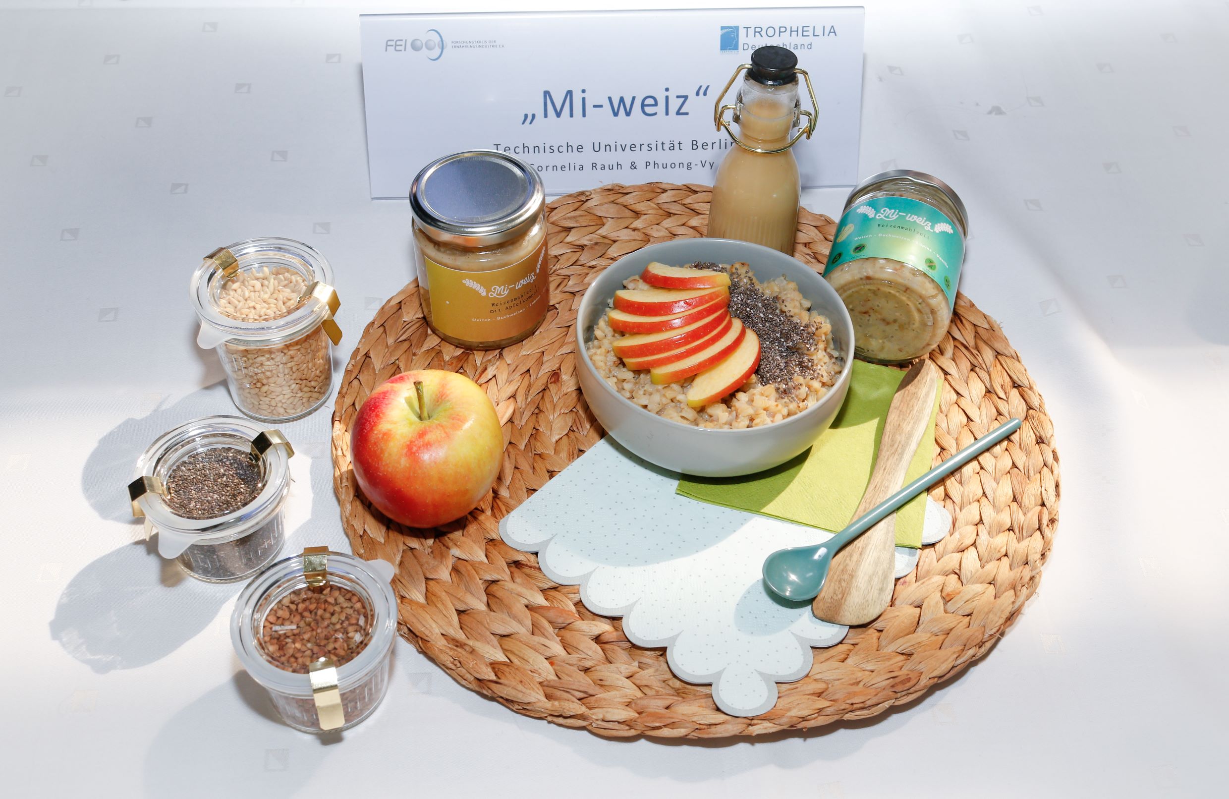 "Mi-weiz" ist eine vegane Süßspeise auf Basis von Weizenkörnern, Buchweizen und Süßlupinen, die als Dessert, Snack oder als Frühstücksbrei verzehrt werden kann. Das Produkt ist angelehnt an ein syrisches Dessert, dessen Konsistenz an Milchreis erinnert. Anstatt der traditionellen Herstellungsweise mit Speisestärke wird die puddingähnliche Struktur mittels Ultraschallbehandlung sowie Citrusfasern erzeugt, die als Nebenprodukte bei der Lebensmittelverarbeitung anfallen. Die Ultraschallbehandlung mit den Citrusfasern bietet mehrere Vorteile: ein neues Texturerlebnis, erhöhte Produktstabilität ohne den Zusatz von Stabilisatoren sowie einen gesteigerten Ballaststoffanteil. Die besondere ernährungsphysiologische Wertigkeit basiert auf den verwendeten Getreide- und Pseudogetreidesorten (aus regionalem Anbau), dem hohen Gehalt an Pflanzenproteinen und Mineralstoffen und durch den Einsatz von Apfelsaftkonzentrat statt Haushaltszucker zum Süßen.