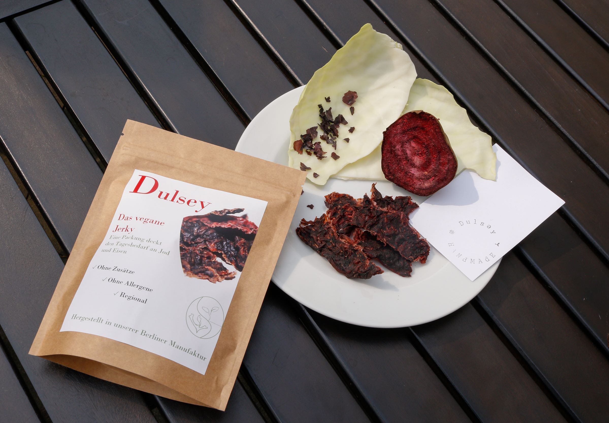 "Dulsey" ist eine vegane Alternative zum Beef Jerky: Ein besonders herzhafter und geschmacksintensiver Snack aus Roter Beete, Rotkohl, Rotalge sowie ultraschallbehandelten Karottenfasern, der schonend dehydriert wird. Die fleischartige Textur wird durch den Einsatz von nassextrudiertem Erbsenprotein erreicht. Die Rotalge Palmaria Palmata (Dulse) sorgt erwiesenermaßen für eine Verbesserung des Hautbildes und dient gleichzeitig als Lieferant für Mikronährstoffe – "Dulsey" ist damit auch ein Produkt im neuartigen Markt der Beauty Foods. Mit einem geringen Fett- und einem hohen Protein- und Balllaststoffgehalt sättigt "Dulsey" anhaltend bei geringem Kaloriengehalt. Auch mit seiner langen Haltbarkeit, dem hohen Convenience-Grad, den regional bezogenen Zutaten und der wiederverschließbaren, biologisch-abbaubaren Verpackung überzeugt "Dulsey" als besonders innovatives und nachhaltiges Produkt.
