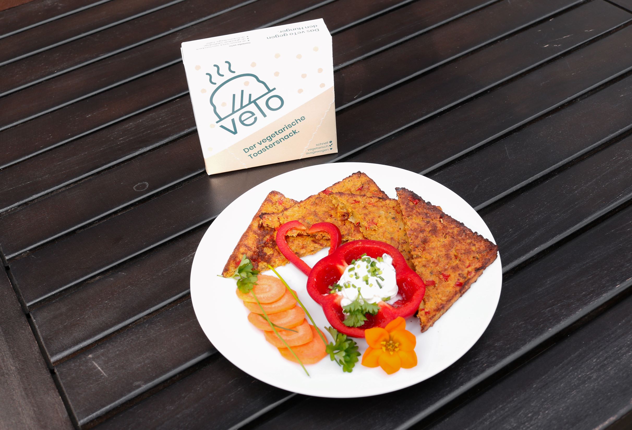 "veTo" ist ein Snack auf Basis von Kichererbsen, in dem zusätzlich verschiedene Gemüsesorten wie Karotten, Paprika, Sellerie und Spinat enthalten sind. Der Snack ist vorgegart sowie eingefroren und ermöglicht damit die schnelle Zubereitung im Toaster. Der Veggie-Toastersnack bietet eine gute Grundlage für eine ausgewogene Ernährung – auch bei einem Lebensstil mit viel Zeitdruck. Durch die Auswahl der Zutaten wird mit "veTo" ein Produkt angeboten, das eine proteinreiche, ballaststoffreiche, vitaminreiche und vegetarische Ernährung ermöglicht und langanhaltend sättigt. Durch den Verzicht auf Fleisch und Fleischprodukte werden Rohstoffe, Wasser und Energie eingespart. Das Erhitzen im Toaster bietet eine energieeffiziente Möglichkeit der Zubereitung im Vergleich zu herkömmlichen Erwärmungsmethoden wie dem Backofen. Und auch mit der Verpackung punktet "veTo": Sie ist plastikfrei.