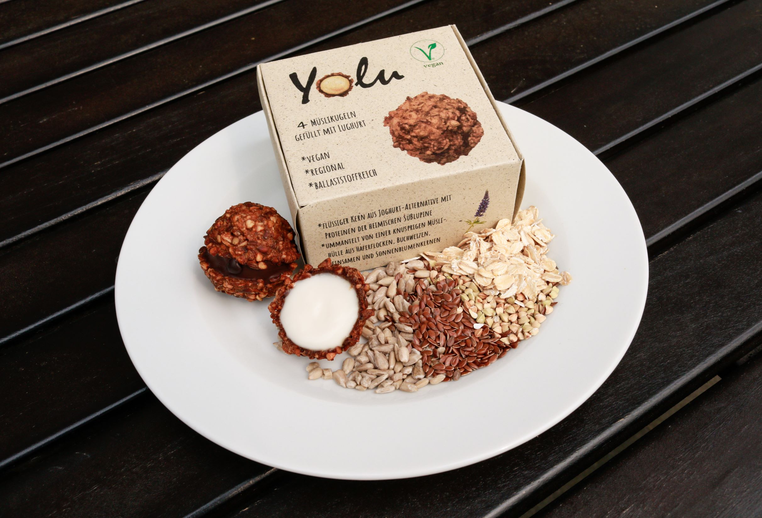 "Yolu", das kleine Frühstück für unterwegs: Mit veganen und regionalen Zutaten hergestellte Müslikugel, gefüllt mit Lupinenjoghurt.