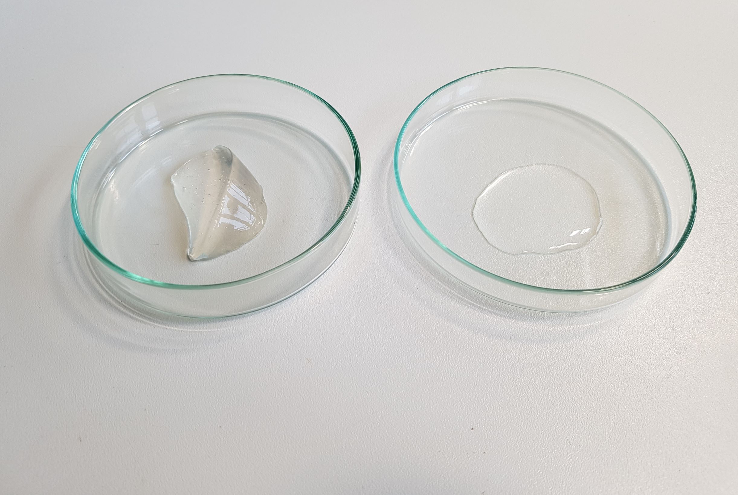 Pektin-Mikrogele bei Vorversuchen im Einsatz: Links eine Suspension mit Wasser, die bei 400 bar homogenisiert wurde, rechts vor der Homogenisierung.
