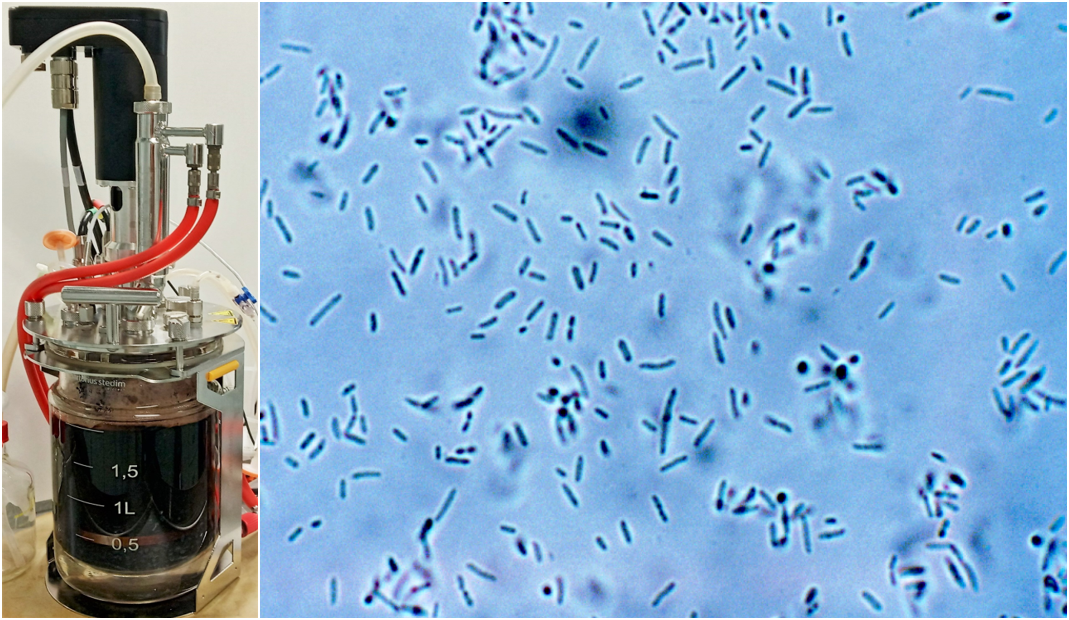 Links: Ein Bioreaktor, in dem Saft im Rahmen der Forschungsarbeiten fermentiert wird. Rechts: Die Gluconsäure-bildenden Bakterien der Spezies Bombella, die für die Untersuchungen eingesetzt werden.