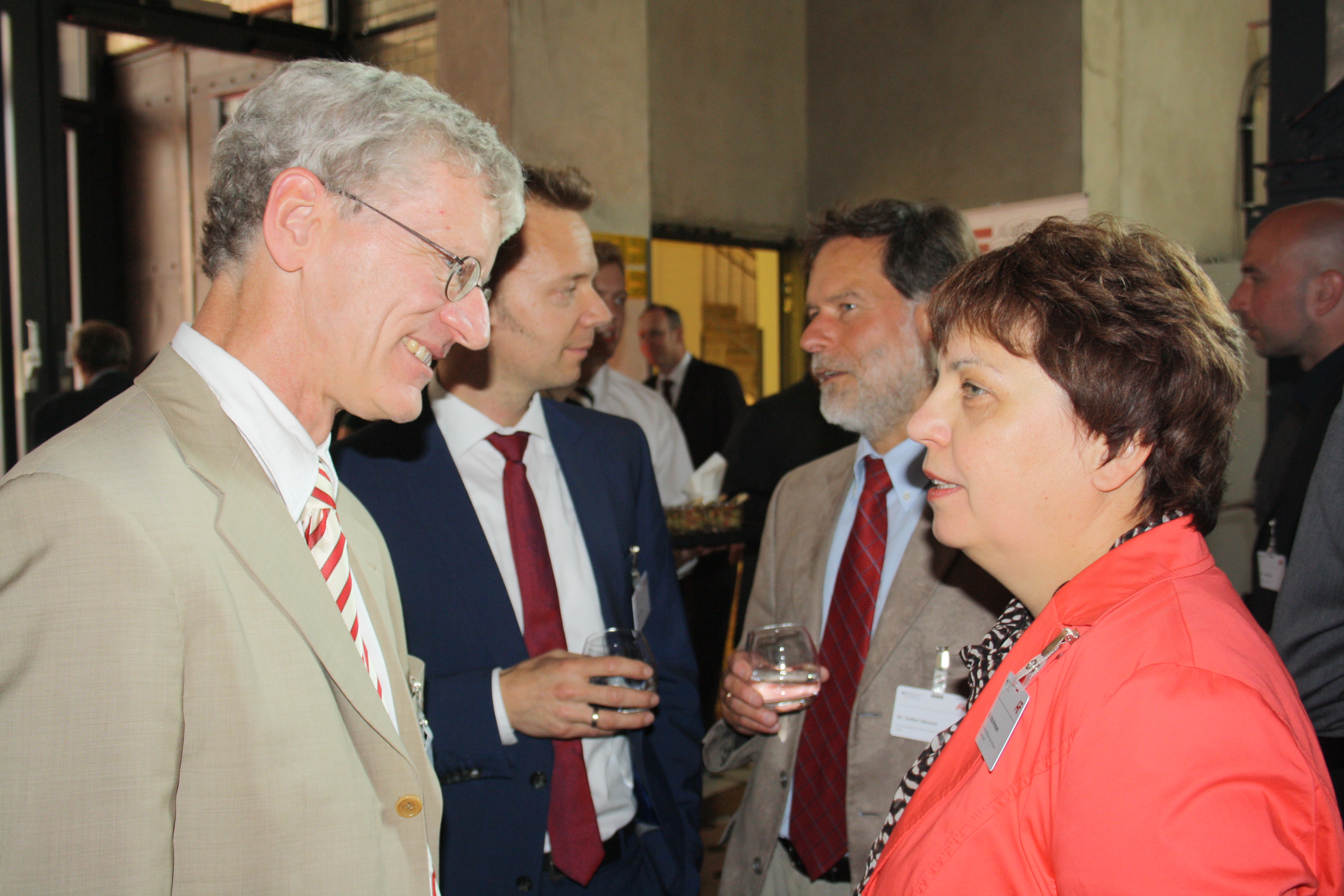Prof. Dr. Ulrich Kulozik (TU München) im Gespräch mit Dr. Erika Hinzmann (Wissenschaftsförderung der Deutschen Brauwirtschaft). Im Hintergrund: IVLV-Geschäftsführer Dr. Tobias Voigt (links) und FEI-Geschäftsführer Dr. Volker Häusser (rechts).