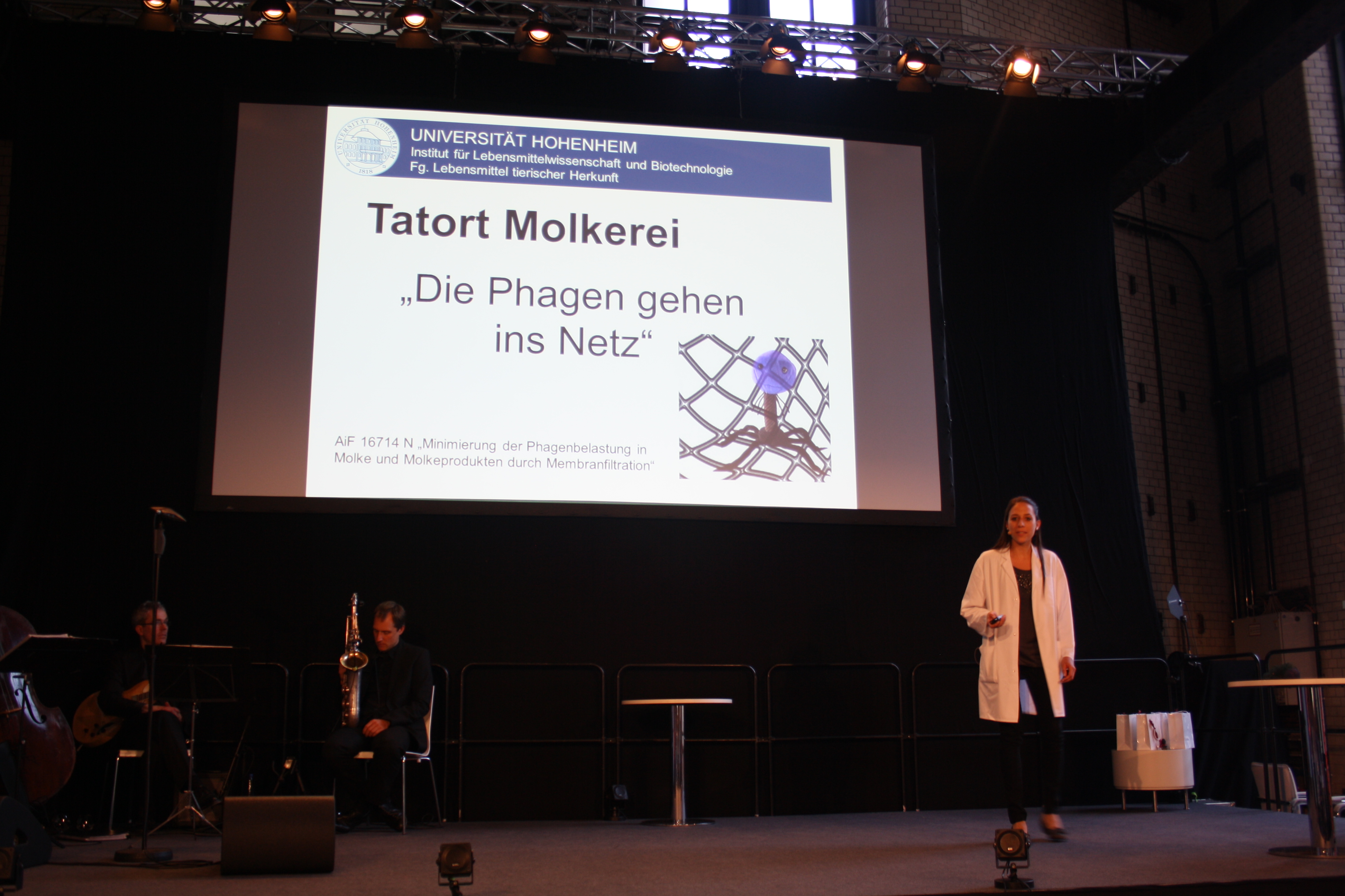 Tatort Molkerei! Doktorandin Meike Samtlebe von der Uni Hohenheim stellt "ihr" IGF-Projekt des FEI beim Science Slam höchst unterhaltsam vor.