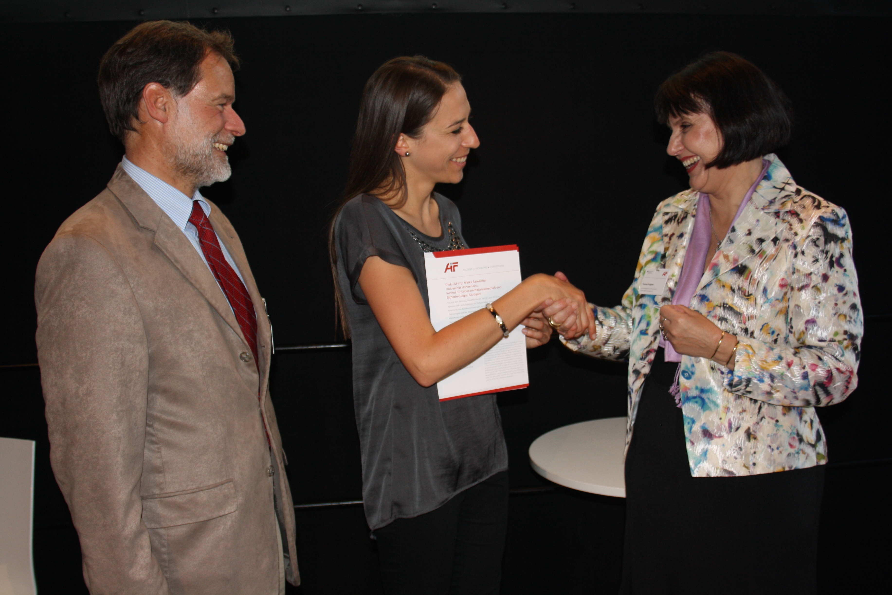 Gewonnen!!! AiF-Präsidentin Yvonne Proppert gratuliert Meike Samtlebe zum Gewinn des ersten Science Slam der AiF. FEI-Geschäftsführer Dr. Volker Häusser freut sich ebenso!