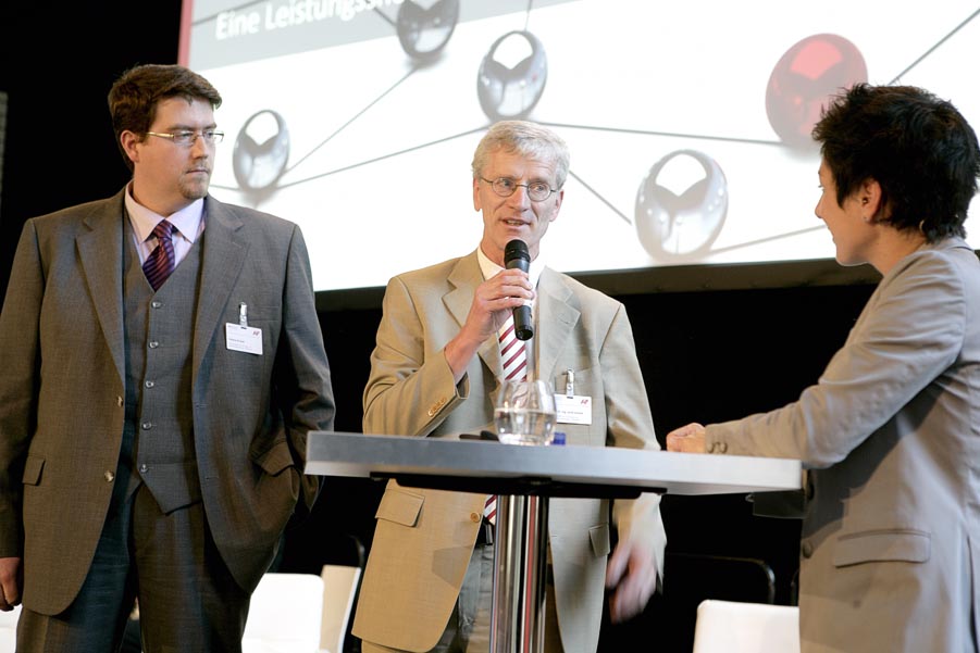 Im Finale für den Otto-von-Guericke-Preis 2013: Doktorand Thomas Strixner und Prof. Dr. Ulrich Kulozik im Gespräch mit Dunja Hayali, Moderatorin der IGF-Leistungsshow.