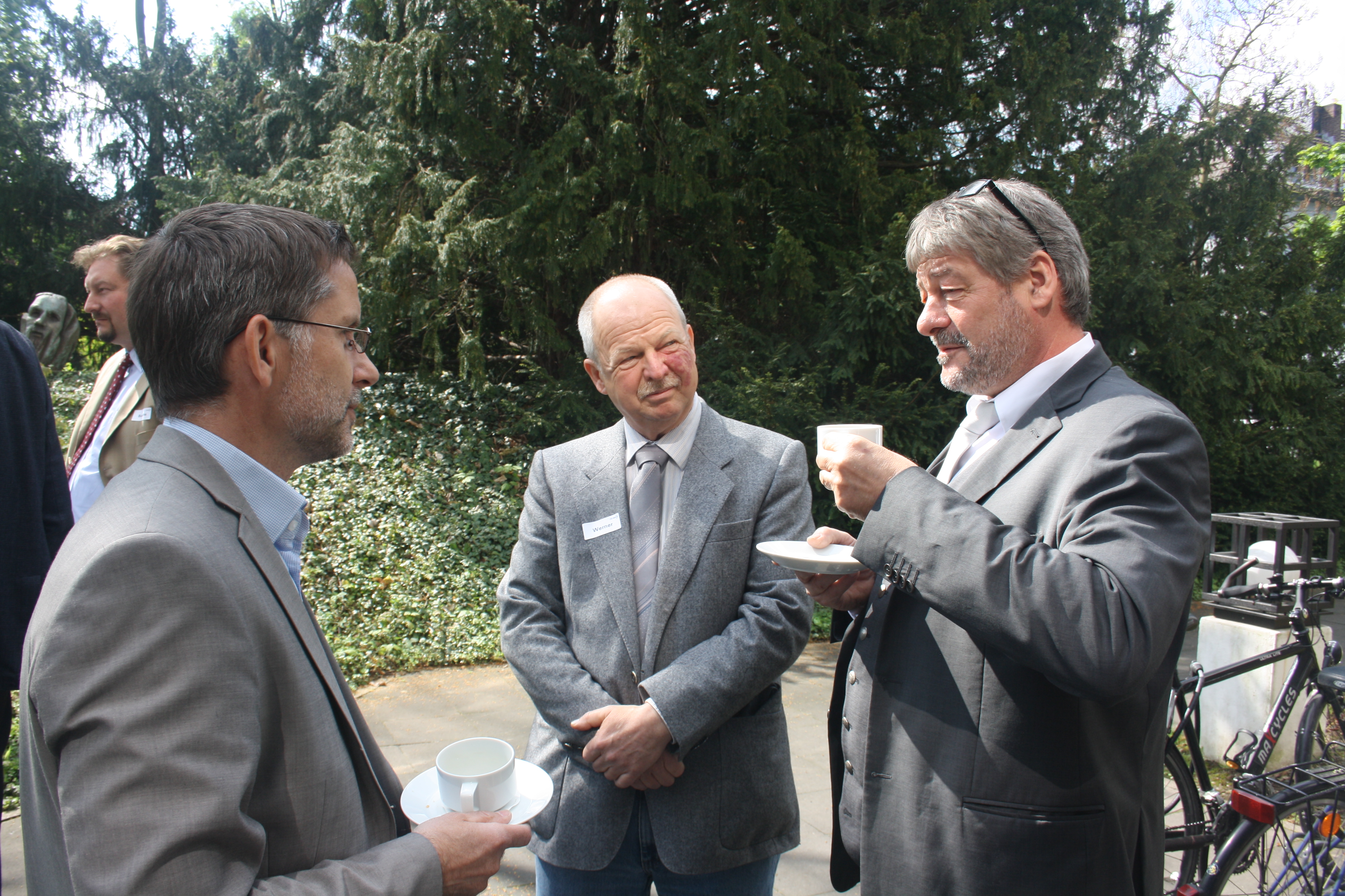 Kaffeepause in der Sonne: Dr. Axel Ruttkat (Haus Rabenhorst O. Lauffs GmbH & Co. KG, Unkel), Martin Werner (riha WeserGold Getränke GmbH & Co. KG, Rinteln) und Hans Mario Dechent (Eckes Granini Group GmbH, Nieder-Olm).