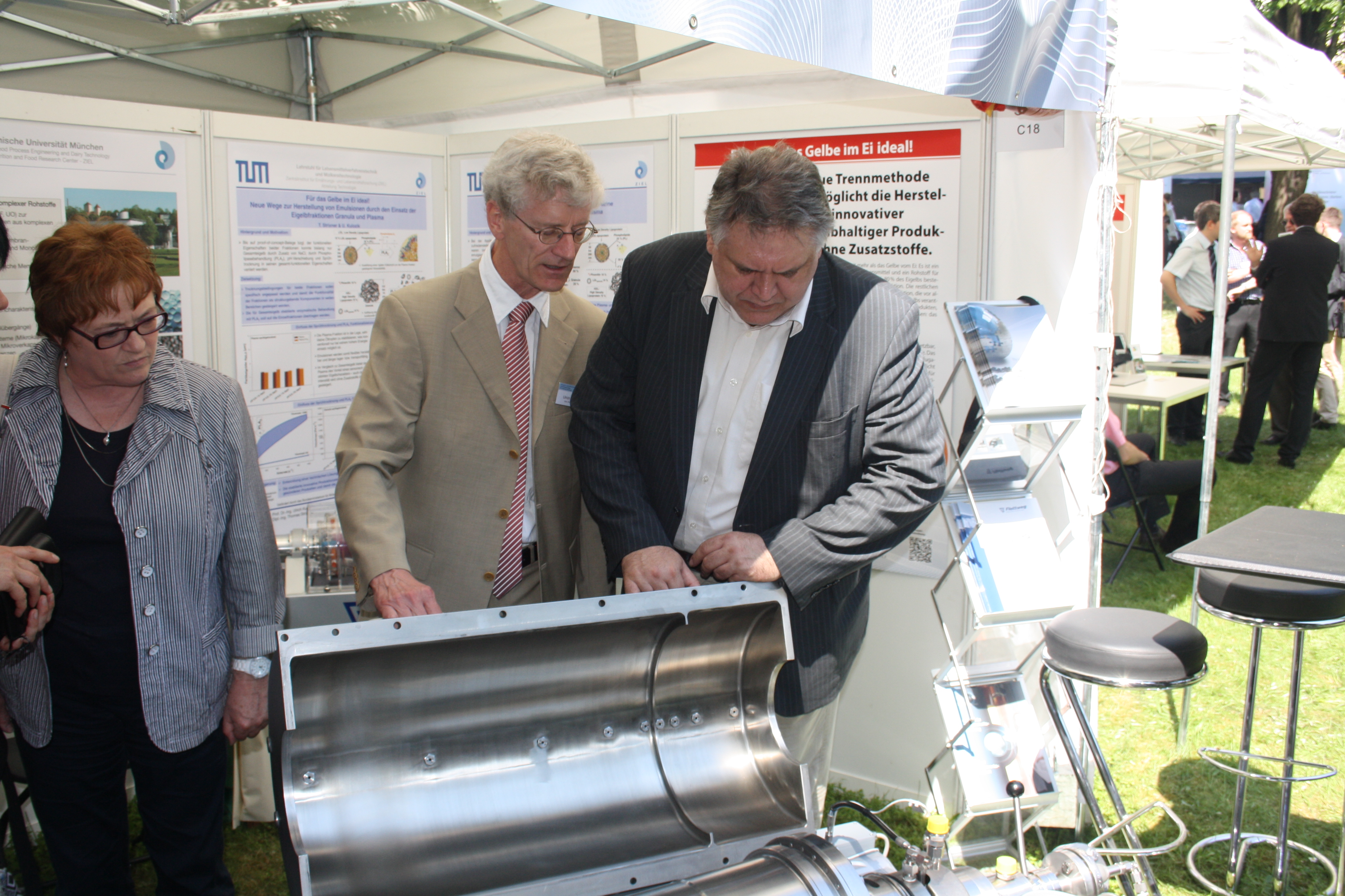 Beindruckt: MdB Joern Wunderlich interessiert sich für das Innere der Dekantierzentrifuge (in der Mitte: Prof. Dr. Ulrich Kulozik).