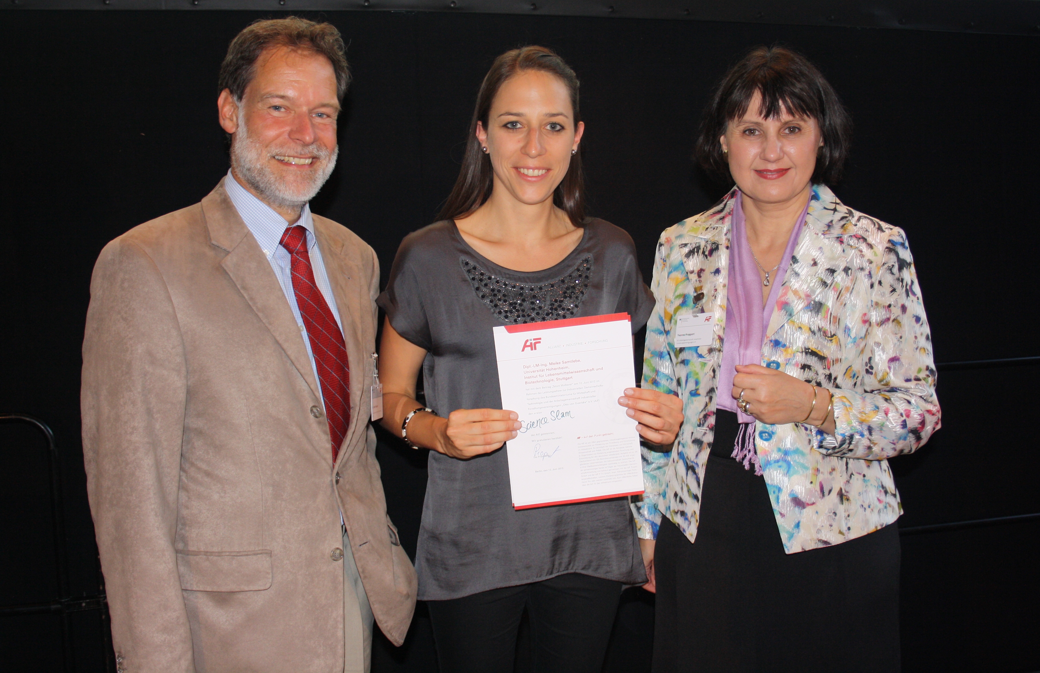 AiF-Präsidentin Yvonne Proppert (rechts) und FEI-Geschäftsführer Dr. Volker Häusser (links) gratulieren der Hohenheimer Doktorandin Meike Samtlebe.