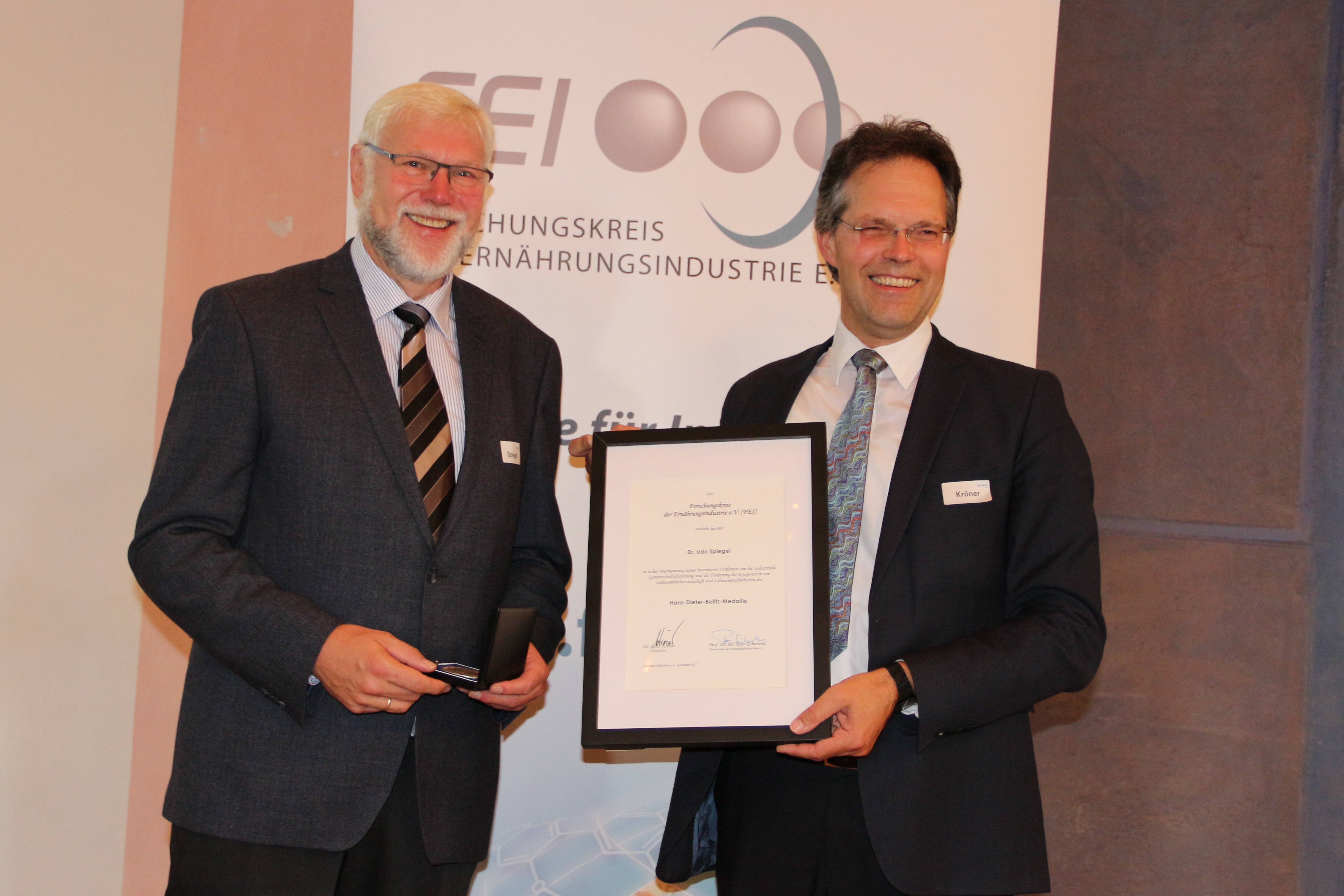 Dr. Udo Spiegel und Dr. Götz Kröner bei der Übergabe der Hans-Dieter-Belitz-Medaille.