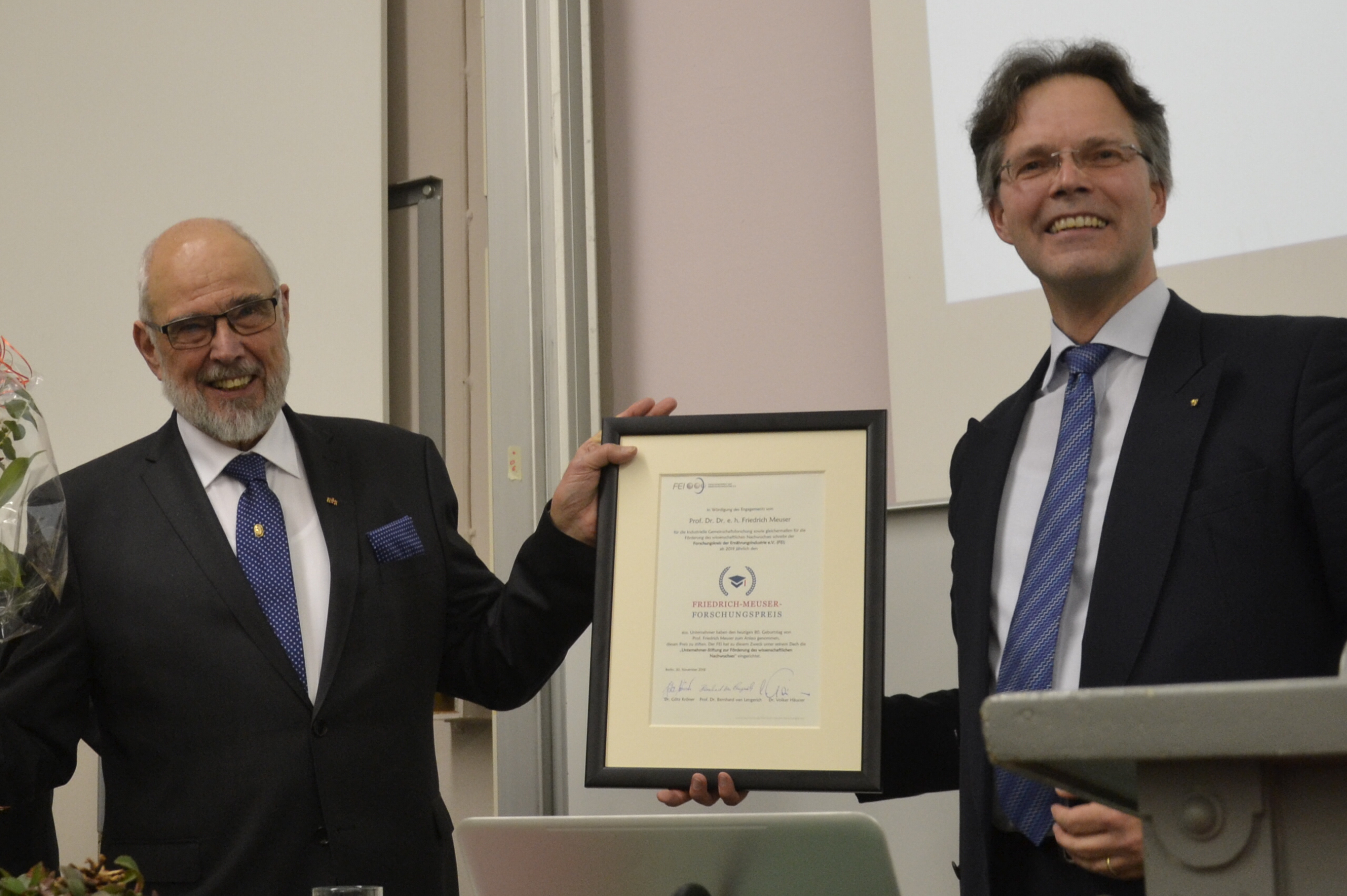 Eine gelungene Überraschung: Prof. Dr. Friedrich Meuser freut sich über die Verkündung von Dr. Götz Kröner, dass der FEI künftig den Friedrich-Meuser-Forschungspreis ausschreiben wird.