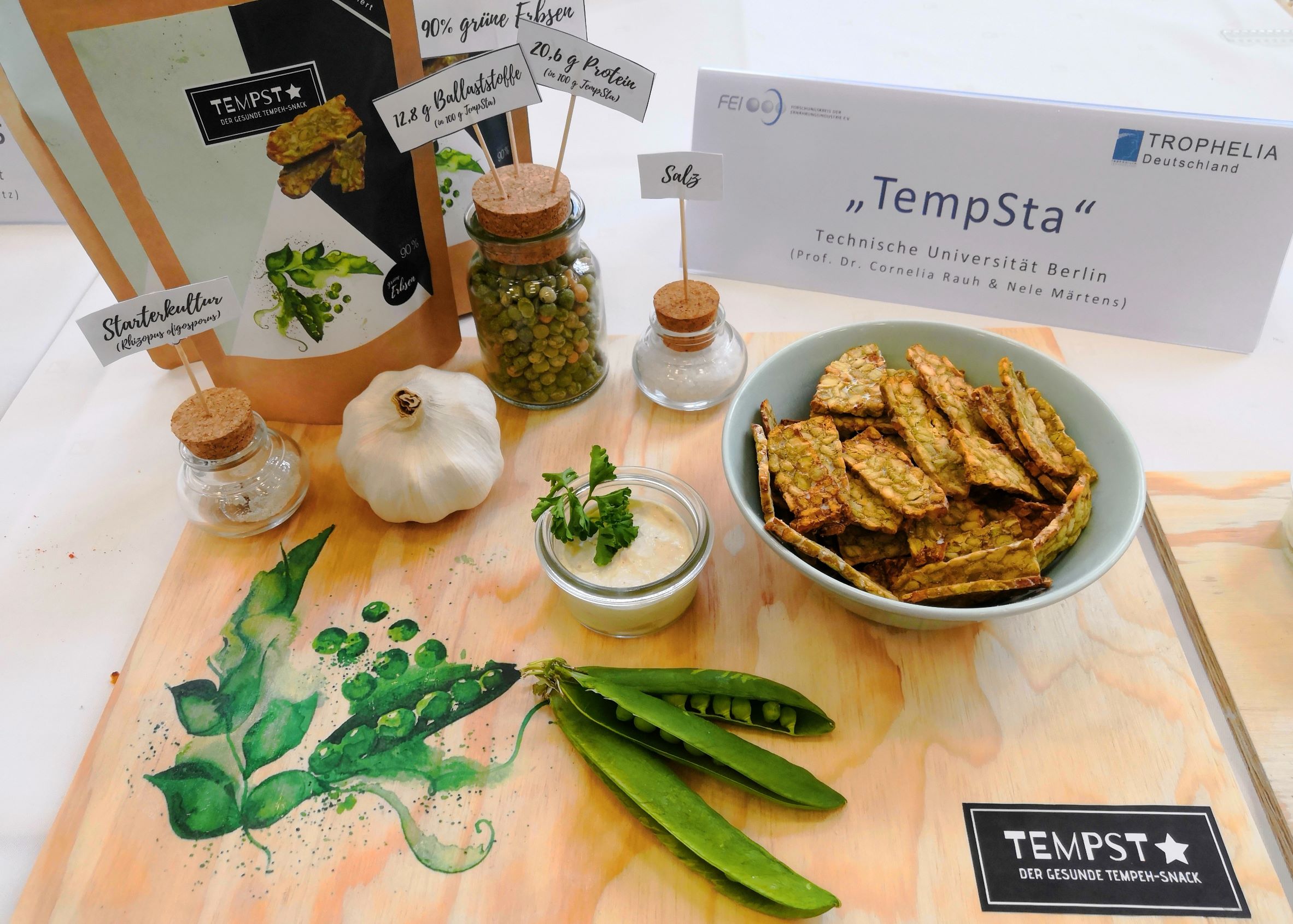 Entwickelt wurde der neue TROPHELIA-Star von einem fünfköpfigen Team von Studentinnen, die an der Technischen Universität Berlin Lebensmitteltechnologie studieren. Für das indonesische Fermentationsprodukt Tempeh werden traditionellerweise gekochte Sojabohnen mit einem Pilz kultiviert – in "TempSta" werden die Sojabohnen durch regional angebaute Erbsen ersetzt, um weite Transportwege für die Rohstoffe zu vermeiden. Nach der Fermentation der Erbsen mit dem Pilz Rhizopus oligosporus wird der Erbsen-Tempeh in dünne Scheiben geschnitten und heißluftfrittiert. Dabei wird Rapsöl sehr fein zerstäubt und mittels Luftzirkulation verteilt, so dass "TempSta" deutlich weniger Fett als durch herkömmliches Frittieren enthält. Der proteinreiche Kräcker für den kleinen Hunger zwischendurch punktet auch mit vielen Vitaminen und Mineralstoffen, ist gluten- und laktosefrei und somit eine optimale Ergänzung zu einer gesunden und bewussten Ernährungsweise.