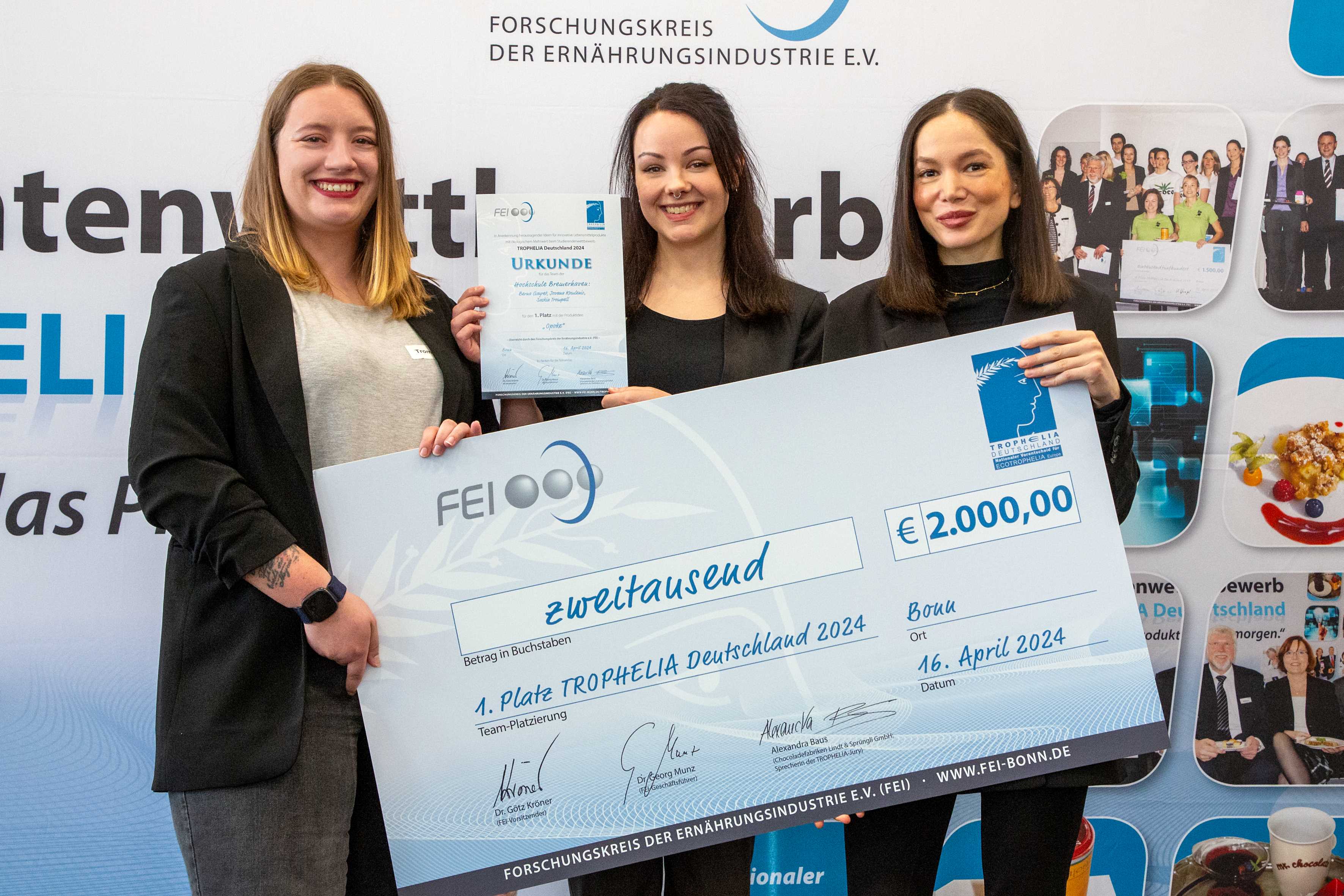 Insgesamt 12 Studierenden-Teams von 5 Hochschulen hatten sich für TROPHELIA Deutschland beworben, um ihre Ideen für innovative Lebensmittelprodukte mit einem ökologischen Benefit vorzustellen. Die besten sechs Teams wurden für das Finale ausgewählt, das am 16. April 2024 im Rahmen des FEI-Kooperationsforums in Bonn stattfand. Nach der Ideen-Präsentation und Verkostung bewertete die Jury die Produktideen nach Punkten in verschiedenen Kategorien. Die Preisverleihung fand im Anschluss an das FEI-Kooperationsforum statt.