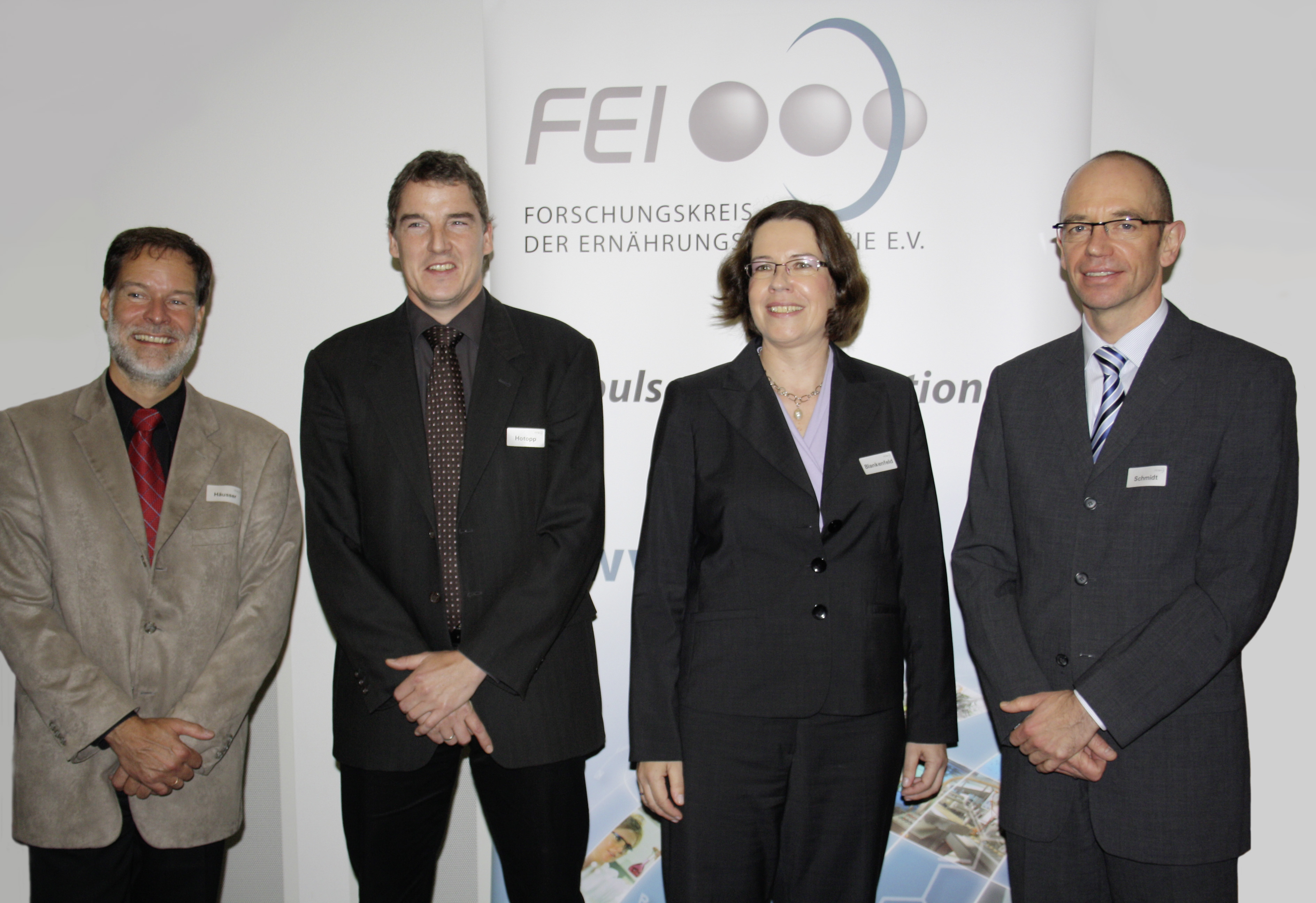 Stehen für Synergien in der Forschungsförderung: Dr. Volker Häusser (FEI), Dr. Torsten Hotopp (DFG), RD'in Ullrike Blankenfeld (BMWi) und Dr. Burkhard Schmidt (AiF).